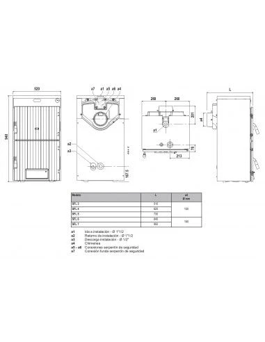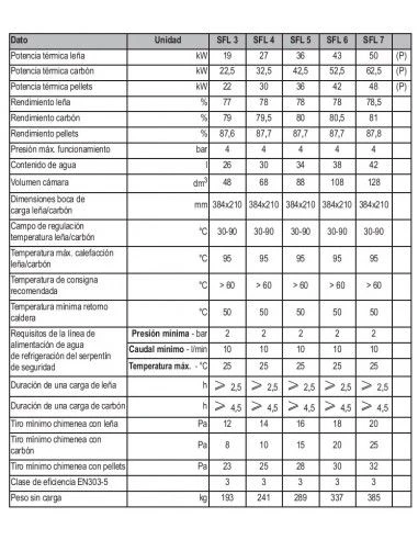 Una vez instalada la puerta de pellet, queda instalada la puerta de leña y así le será muy fácil poder trabajar con el policombustible que le interese, bien sea: pellets o leña. Con una potencia térmica de 19 Kw a 27 Kw en leña, 22.5 Kw a 32.5 Kw en carbón y 22 Kw a 30 Kw en pellet ( dependiendo el modelo de la caldera ). Con el máximo rendimiento térmico de 77% en leña, 79.5% en carbón y 87.6% en pellets para el modelo SFL 3 y con el máximo rendimiento térmico de 78% en leña, 79.5% en carbón y el 87.7% en pellets para el modelo SFL 4. Su presión máxima en funcionamiento es de 4 bar.