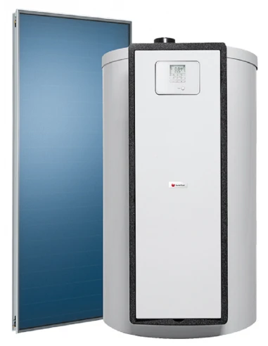 Placa solar Saunier Duval HELIOSET DB 250 2F con drenaje automático para instalaciones individuales de ACS, montaje en cubierta plana, acumulador de 250 litros, 2 serpentines y 2 captadores, Clase energética B