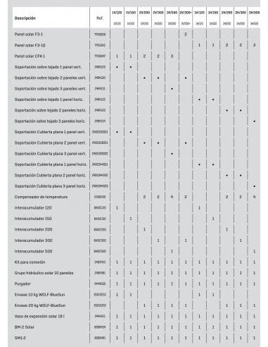 Los kit de apoyo solar están disponibles según el número de captadores que contiene, la orientación de estos, la capacidad del acumulador y la cantidad de serpentines de este. Hay versiones para 2 serpentines y versiones de 1 serpentín.