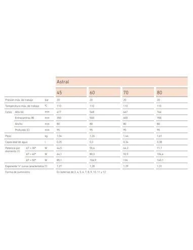 El radiador de aluminio Baxi ASTRAL 60 da prestigio por la elegancia, valor y calidad de su diseño de frontal plano, que se adapta a los gustos más modernos y a las necesidades de diseño de interiores, manteniéndose a la vanguardia de la manera más discreta. Este Radiador de aluminio Baxi Astral 60 de 4 elementos con 568 mm de altura es de fácil mantenimiento, gracias a la simplicidad en el diseño de sus laterales y el frontal plano facilitan al máximo la limpieza de posibles residuos de polvo. Disponible en 4 modelos de 45, 60, 70 y 80 y suministrado en baterías de 3 a 12 elementos.