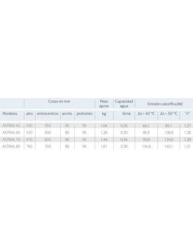 El diseño del radiador Baxi ASTRAL 80 da prestigio por la elegancia, valor y calidad de su diseño de frontal plano, que se adapta a los gustos más modernos y a las necesidades de diseño de interiores, manteniéndose a la vanguardia de la manera más discreta. Este Radiador de aluminio Baxi Astral 80 de 4 elementos es de fácil mantenimiento, gracias a la simplicidad en el diseño de sus laterales y el frontal plano, facilitan al máximo la limpieza de posibles residuos de polvo. Disponible en 4 modelos de 45, 60, 70 y 80 y suministrado en baterías de 3 a 12 elementos.