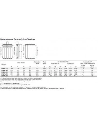 El Radiador de aluminio Dubal 80 permite su instalación con frontal plano o con aberturas. Este modelo Dubal 80 está formado por 7 elementos acoplables entre sí mediante manguitos de 1″ rosca derecha-izquierda y junta de estanquidad. Los elementos son fabricados por inyección a presión de la aleación de aluminio previamente fundida.