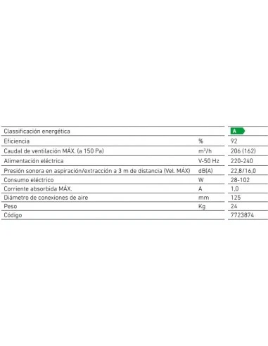 - Intercambiador de calor de poliestireno, de tipo flujos en contracorriente, cuya morfología particular garantiza eficiencias de intercambio térmico de hasta el 92 %.Control de cable suministrado con la unidad con indicador automático de cambio de fltro, selector de apagado y encendido, selección de velocidad, y señal de anomalías