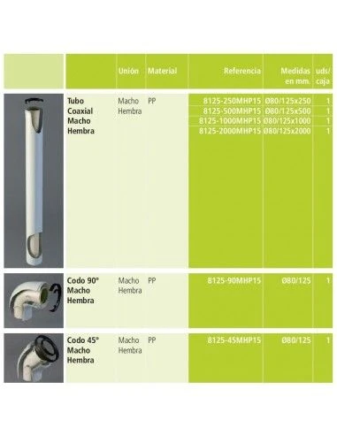 Tubo coaxial de polipropileno Fig 8125-250MHP15, diámetro 80/125 mm, largo 250 mm, blanco, unión Macho-Hembra, aparatos de condensación, instalación individual y colectivas en interior